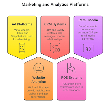Retail Media Platforms: Connect to retailer networks such as Carrefour Media Network and Amazon DSP. These platforms let you run ads directly where shoppers buy. Make sure the performance data - impressions, clicks, and attributed sales - feeds back into your analytics stack for unified measurement.