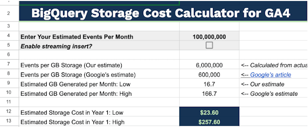 We've created a spreadsheet that you can use to estimate your Google Analytics storage costs in BigQuery (see screenshot below).