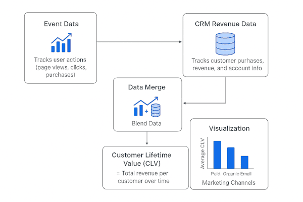 - Dashboards: Connect BigQuery or GA4’s API to a BI tool like Looker Studio or Looker for reporting. These tools let marketers build custom reports and track KPIs such as conversion rates, retention, and repeat purchases without the limitations of GA4’s UI. For example, Looker Studio can merge event data with CRM revenue to calculate customer lifetime value by channel. Together, this stack captures every touchpoint from visits to purchase and repurchase, enabling accurate CLV calculations.