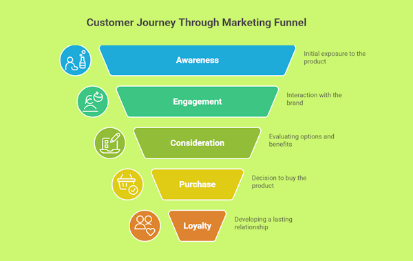 The table below outlines each stage of the marketing funnel - Awareness, Engagement, Consideration, Purchase, and Loyalty - along with the stage’s meaning, key performance metrics, measurement tools, and example insights or outcomes.